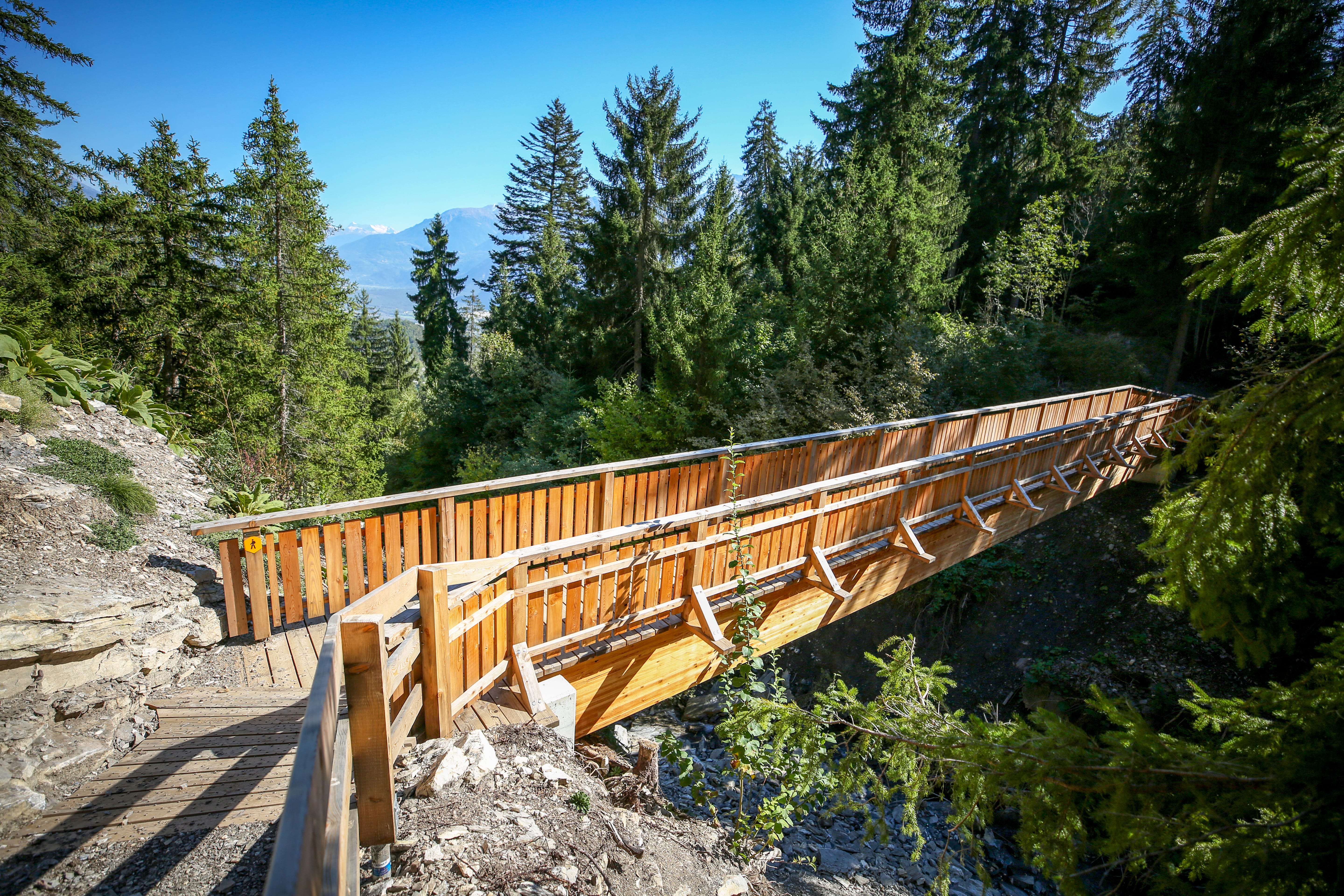 Après le déplacement du sentier de randonnée existant entre Le Coudry et Les Clévettes, la commune (Association des communes de Crans-Montana) a fait construire deux nouvelles passerelles en mélèze de la région. Situés sur le nouveau tracé, ces deux ouvrages, de 5 mètres et 15 mètres de long respectivement, s’intègrent parfaitement dans le paysage.