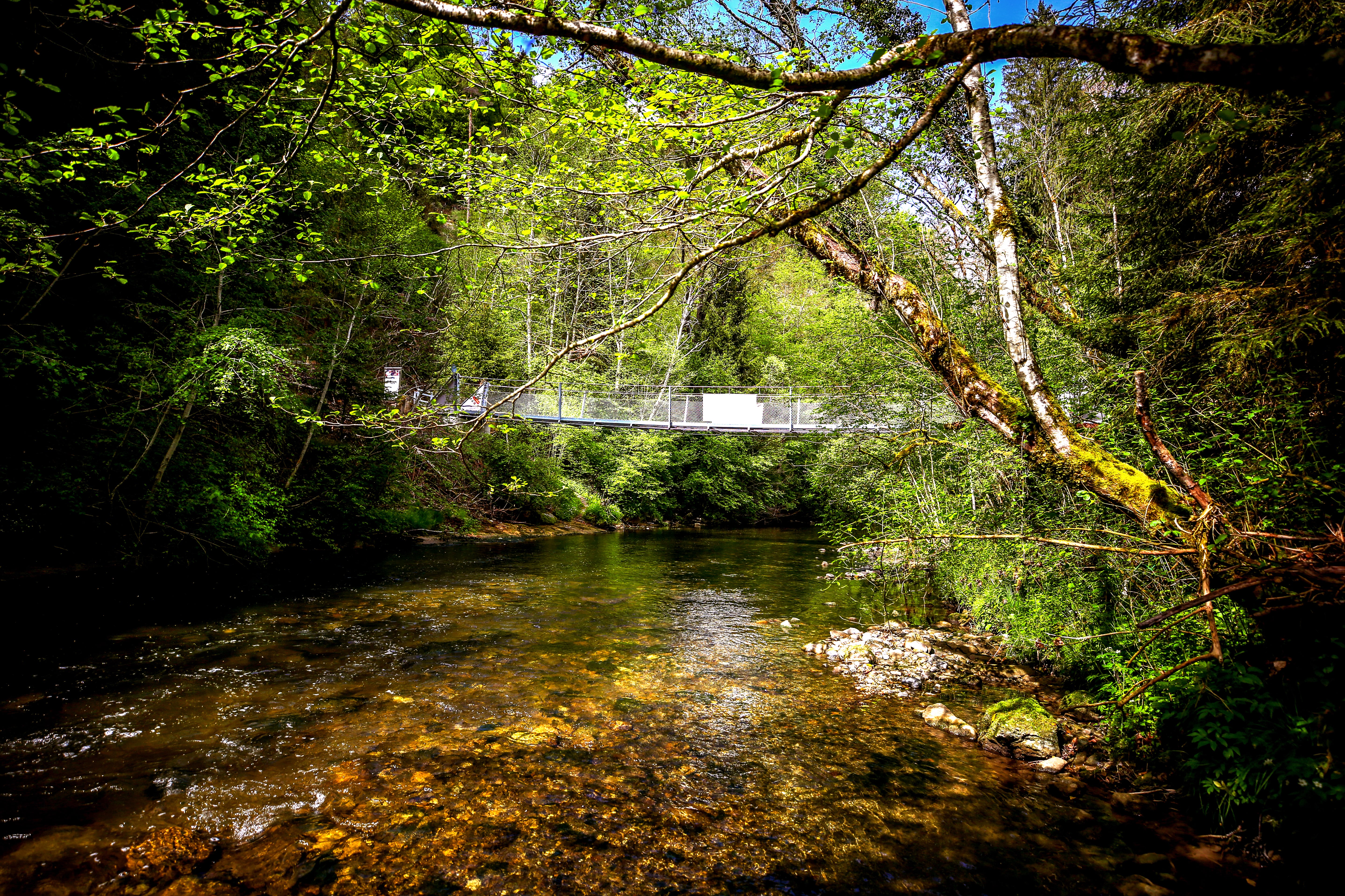 Non loin de la commune grisonne d’Ausserferrera, légèrement en amont d’Andeer, un nouveau pont suspendu en bois enjambe le Ragn da Ferrera (Rhin de Ferrera).